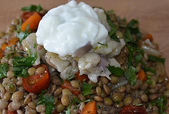 Las añadimos a las lentejas junto con el perejil picado, mezclamos bien, probamos y corregimos de sal. Repartimos las lentejas entre los platos. Añadimos un par de cucharadas de berenjena en el centro y por último, condimentamos con una cucharada de yogur por encima. Aliñamos con un chorrito de aceite.