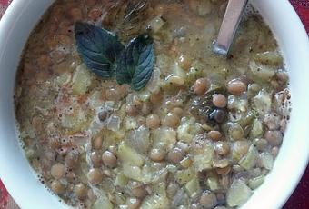 Pica un ramillete de menta y salpimienta el guiso, añade caldo de verduras hasta que estén cubiertas las lentejas y deja cocer unos quince minutos a fuego muy bajo.