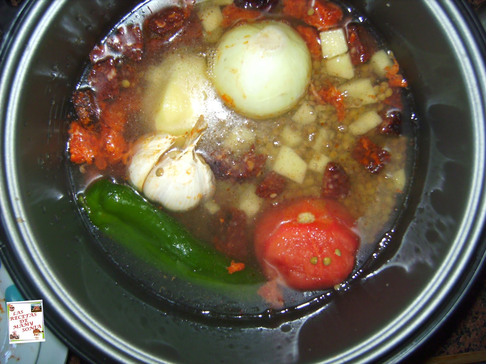 La noche antes pondremos las lentejas en remojo. Incorporamos a la cubeta las lentejas, la cebolla, la cabeza de ajo, el pimiento y las patatas