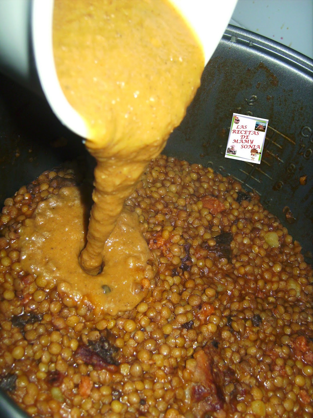 Echamos el batido obtenido a las lentejas y mezclamos si viésemos que necesitan un poco de agua ahora seria el momento y agregamos la sal mezclamos bien