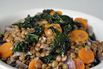 En una olla, ponemos agua a hervir y cocemos las lentejas escurridas durante 30 minutos a fuego lento. Mientras, lavamos y cortamos la kale, la zanahoria y la cebolla.