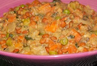 200gr. de lentejas pardinas 2 zanahorias Un puñado de espinacas 1 cebolla 1 diente de ajo 3 espárragos verdes 5 champiñones Un puñado de guisantes frescos 1 brick de nata de soja Vino blanco 1 pastilla de caldo vegetal Sal marina, pimienta negra, nuez moscada Aceite de oliva VE