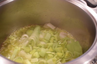 Pon a calanetar el aceite en una cacerola. añade la cebolla y el puerro picados.