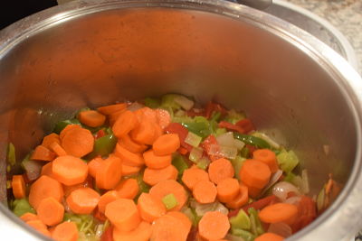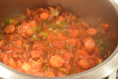 Rehoga un poco y añade las zanahorias peladas y cortadas en rodajas. Espera a que las zanahorias comiencen a ponerse tiernas. Pon el tomate triturado y la cucharadita de pimentón dulce. Siempre a fuego medio para que el pimentón no se queme. Remueve y rehoga durante un par de minutos.