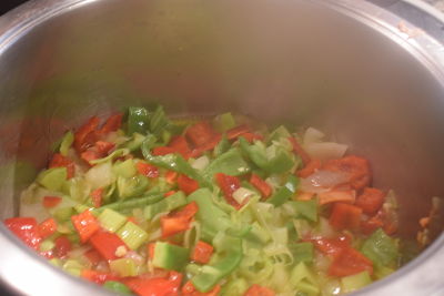Cuando la cebolla se torne tranparente incorpora el pimiento verde y rojo picados. También los ajos laminados.