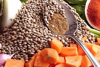 - Lentejas pequeñas tipo Lanzarote 400 g.- Tomate 1.- Cebolla 1.- Pimiento verde 1.- Ajos 4.- Laurel 1 hoja.- Apio 2 ramas.- Zanahorias 2 grandes.- Pimentón de la Vera 1 cucharada sopera colmada.- Cominos molidos 1 cucharada sopera rasa.- Caldo de carne 2 pastillas.- Sal.- Pimienta en grano.- Aceite de oliva.
