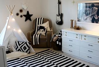 Una habitación de lo más cool para Leo…estrellas y guitarras siempre hicieron buena sintonía. Un gris apagado de fondo entre dorados, blancos, rayas…..y algo que no puede faltar en una habitación de niño, es un Tipi… podéis encontrar diferentes modelos en TipTopTeepeeShop, textiles en dorado y cojines de chaplín…en Manor…peluches elefante en Rhbaby&Chid…yel toque, lo ponen los Beatles ,presidiendo una cómoda reformada en blanco y con tiradores dorado…no puede tener más toques Chic.