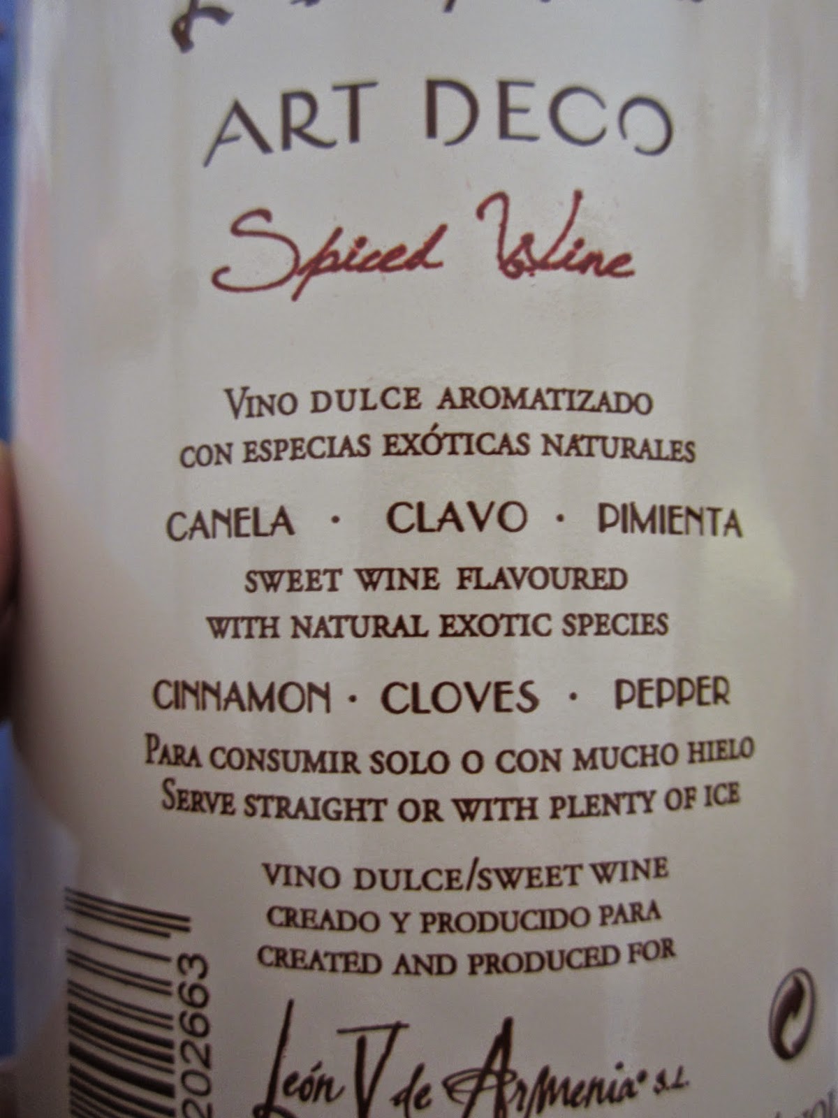 CLAVO - CANELA - PIMIENTAArt Deco Spiced Wine es el fruto del buen hacer artesanal español a lo largo de 200 años y la suma de un espíritu innovador que nos permite presentar en primicia mundial este vino dulce especiado. Es nuestro tributo a la más bella época del siglo XX,la del ART DECO, cuyo estilo ha fusionado a la perfección los detalles del diseño occidental con elementos orientales.Creado con el mismo concepto del ART DECO por los mejores maestros de España, este vino generosoexcita las sensaciones y deleita el paladar.Presentado en una botella de efecto porcelana auténtica, una obra escultórica que refleja el espíritu, la clase y la elegancia del surrealismo.Forma parte del Cocktail "ART DECO LOUNGE".ART DECO LOUNGE