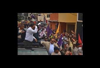 El mandatario, quien en esta campaña electoral es el refuerzo del candidato presidencial del PLD, Danilo Medina, en varias ocasiones reaccionó con la tradicional señal de girar en círculo su dedo índice de la mano derecha en su cabeza, para responder a los simpatizantes del Partido Revolucionario Dominicano que rechazaron su presencia mostrándole el dedo pulgar hacia arriba, señal del triunfo de Hipólito Mejía.