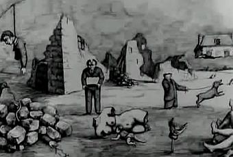 Pero, a diferencia de "Les escargots", el presente corto no es un relato propiamente tal sino que una reflexión, mejor dicho un ensayo filmado. Un potente ensayo, poderosamente fílmico, de nueve contundentes minutos. La cosa comienza como un relato de ciencia ficción: una voz francesa nos introduce en un planeta en el que sus habitantes nacen, viven y mueren para matar. Matar, matar, matar. Muerte, destrucción, maldad. Luego, entramos en materia (aún más). "Les temps morts" busca ser un fiel reflejo no ya de nuestra realidad sino de la repugnante hipocresía de la humanidad, de su ridícula indulgencia y aún más indecorosa y procaz autocomplacencia. Busca dar cuenta de las vitales y fatales contradicciones de la sociedad, de lo absurdo de su conformación moral tal cual es ahora. Mediante violentas y desoladoras imágenes que parecen irreales, casi como si no pudiera ser cierto que la tierra es así, que el hombre es así, acompañadas de videos de carne y hueso, la voz en off nos sumerge en este círculo vicioso de sangre, muerte y guerra de un ser que, tal como el narrador señala, si no se está matando a sí mismo, está matando a todo lo que le rodea. Peor, muestra cómo esa muerte se naturaliza, se perdona, se vuelve costumbre. En esta pieza, Leloux básicamente vuelca sobre el fotograma lo peor del ser humano sin ninguna luz que ilumine el camino o apunte una salida. Es fuego, es un golpe a los acomodados y a los ciegos, a los ilusos, a los tontos. Muchos no acusarán recibo, puede que nada lo haga, y tristemente es justo eso de lo que el corto nos advierte y denuncia, de lo que debemos despertar y huir. La imagen de abajo es elocuente a más no poder: un hogar cuyas murallas fueron construidas con cabezas decapitadas: la base de toda unidad básica social. ¿Queda alguna pregunta por hacer?