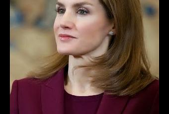 Dña. Letizia eligió un look ejecutivo compuesto por top de punto y chaqueta entalalda a juego en color vino burdeos, pantalones grises rectos y zapatos de estilo salón con detalles.