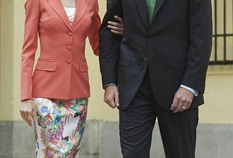 Dña. Letizia repitió un vestido de seda en print floral, de línea lápiz por encima de la rodilla, que combinó con chaqueta en tono coral y las consabidas sandalias que mostraban sus pies poco "favorecidos".