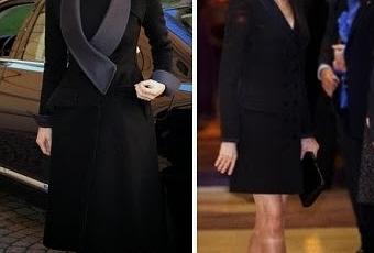 Charlene de Mónaco lució anteayer un original y espléndido abrigo de estilo esmoquin, cortado en la cintura y con falda acampanada unos centímetros por debajo de la rodilla, que combinó elegantemente con medias negras y zapatos de salón a juego.
