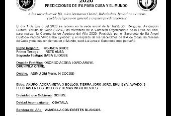 El día 1 de enero del 2020 se reúnen en la sede social de la Institución Religiosa Asociación Cultural Yoruba de Cuba (ACYC) los miembros de la Comisión de la Letra del Año, para realizar la Ceremonia de Apertura del año 2020. Presidida por el Sacerdote de Ifá Ángel Custodio Padrón «Awo Baba Eyiobbe» y el respaldo de los Sacerdotes de IFA de todas las familias de Cuba y sus descendientes en el mundo, sacó la Letra del Año el Sacerdote más pequeño.