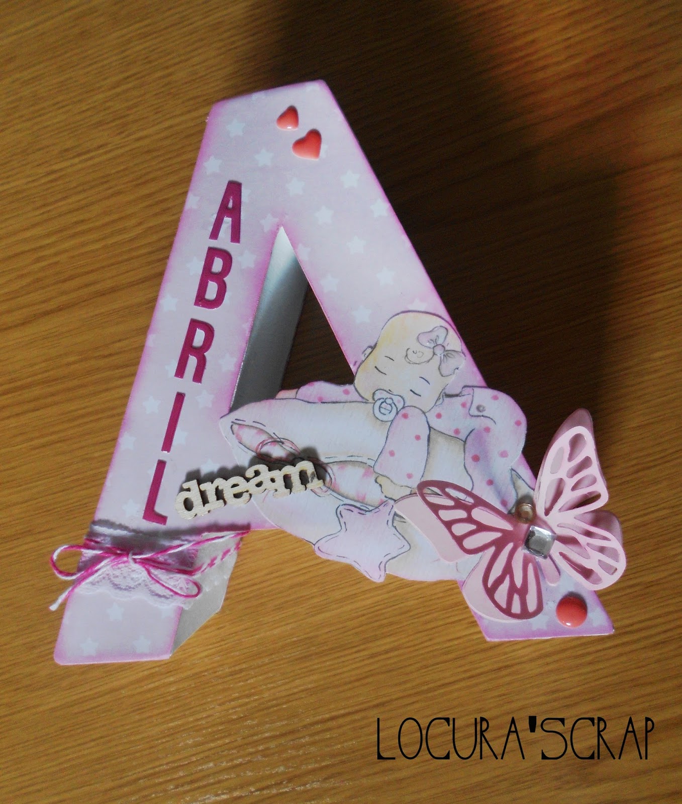 Abril , es una bebe ya con unos meses , a la que aun no conocemos , pero estoy segura que estará muy muy comestible ,es ya una mas de la gran familia de radiosolxxi , hija de Alicia otra locutora a la que apreciamos un montonazo , y a la que tambien escuchamos diariamente. Este regalito quisimos hacérselo por su nacimiento , no podía faltar algo de scrap en ese momento tan especial , espero que la haya gustado mucho a la mami y ya tenga su lugar dentro de la habita de la muñequita .-)