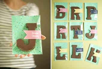 Letras de chocolate, eso es, las iniciales de nuestros invitados convertidas en riquísimas letras de chocolate, perfectamente envueltas y con la etiqueta del nombre y apellidos completos del comensal.