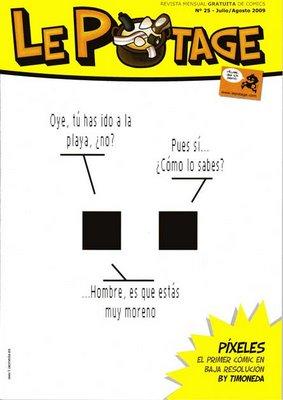 Presentado por “Ruleta Rusa” y de la mano de Timoneda, conocido de mis tiempos en el foro de “Los seguidores del Ni”, llega este muy pequeño tomo en un regio blanco y negro (bueno... son píxeles, no hay nada mejor para ellos, con alguna excepción) en el que durante las páginas que lo componen tendremos una muestra del ingenio y sátira de su creador, dejando claro que para hacer una obra que entretenga no hace falta tener un gran capital o pasar por el aro una enorme distribuidora.