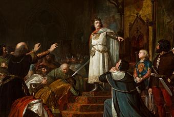 No había finalizado el eclesiástico de hablar cuando la duda quedó disipada. El rey en persona acababa de irrumpir en la sala, acero en mano, dejando absortos a todos los presentes. El soberano se colocó en el centro de ellos, y con el semblante serio comenzó a hablarles: