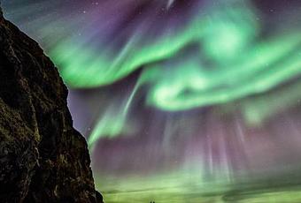 La tierra es Islandia, específicamente Vik y M˝rdal, un pueblo del sur conocido por sus playas de arena negra. El mar, el Océano Atlántico, rodea Reynisdrangar, un conjunto de columnas de roca basáltica erosionada que según el folclore islandés son los restos petrificadas de trolls que una vez intentaron arrastrar un barco de tres palos en el suelo. En la parte superior derecha está el dios del cielo según la mitología griega: Júpiter. En el cielo también se ven otras leyendas griegas agrupadas en constelaciones como un león (Leo), un gran oso (Osa Mayor) y una serpiente de agua (Hydra). Se podría suponer que todo este alboroto dio lugar a las espectaculares auroras fotografiadas, pero en realidad sólo eran explosiones procedentes del Sol. Pasando el cursor por encima de la imagen aparecen unas anotaciones.