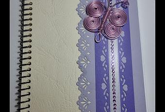 Esta es la decoración de la portada. Todo en tonos lilas. El detalle de la mariposa está hecho con alambre rosa (en la foto de abajo se aprecia mejor el detalle). Ambas tapas, tanto la delantera como la trasera están hechas con cartulina texturizada blanca.