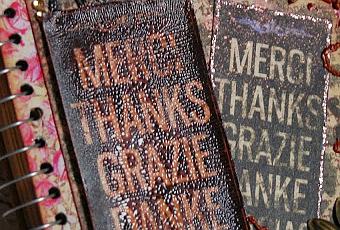 Puse un trocito de blonda entintada en una esquina, un par de adornos de madera, unos cristalitos, la flor de metal, unas gotitas de tinta por ahí y por acá y unos cuantos chorros de una pintura medio seca color cobre que tenía por ahí guardada y que me vino de perlas para el guarreo :P