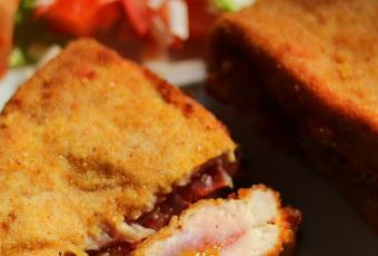 Podéis comprar el lomo de cerdo entero y cortar los librillos vosotros mismos o utilizar los filetes de cinta de lomo ya cortados. Ya sabéis que los productos de Carne Villa María son excelentes y además te los traen a casa, más cómodo imposible. Utiliza el cupón "navidad5" y encima te harán el 5% de descuento sobre sus precios oficiales. Abrimos los librillos de lomo de cerdo y echamos un poco de sal en su interior. Colocamos encima una loncha de jamón bien extendida y untamos la mitad del jamón con dos cucharadas de mermelada de mango casera. Alternativas: Si lo preferís podéis hacer esta misma receta con mermelada de melocotón, albaricoque o ese tipo de mermeladas de frutas dulces y no ácidas. También podéis utilizar láminas de mango o de melocotón en almíbar en lugar de la mermelada. Cerramos los librillos y los pasamos por harina, huevo batido y pan rallado. Los freímos en aceite bien caliente hasta que se doren. Escurrimos en papel absorbente y los llevamos a la mesa. Todos a comer que están buenísimos.
