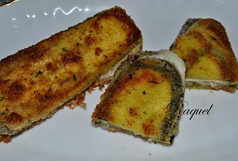 Una berenjenaUn huevoPan rallado con ajo y perejilLonchas de jamón de pavoQueso en lonchasAceite de olivaSalPreparación:Lavamos bien las berenjenas y las cortamos a rodajas finas como cuando lo hacemos con la carne sin terminar de cortar uno de los bordes.Ahora abrimos el librito ponemos una loncha de jamón y otra de queso y lo volvemos a cerrar.Batimos el huevo y le añadimos sal, lo pasamos por el huevo y luego por pan rallado y así con todos.Ponemos una sartén con aceite y los vamos friendo, conforme los vallamos sacando lo ponemos en un plato con papel absorvente, para que absorba los restos de aceite.