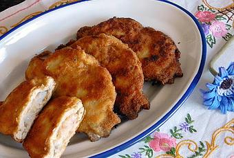 - 4 filetes de lomo cortados para libritos o 8 filetitos muy finos- 4 lonchas de queso para fundir (tranchettes)- 16 gambas- 1 huevo- pan rallado- aceite de oliva- sal
