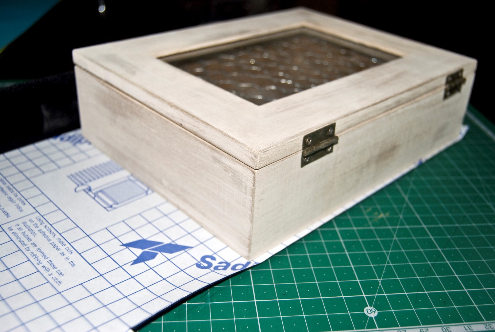 Volvemos a montar la caja con sus bisagras, cierre y cristal. (sin la foto que traía).