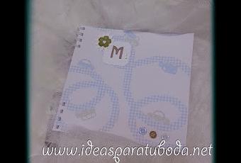 Y este libro que os enseño es muy especial, Marco ha nacido hace poquito y con él sus papis quieren anotar cada momento de su pequeño. Para este libro escogimos una portada en tonos azules y verdes tal y como nos pedían sus papis, con unos coches muy divertidos que van subiendo y bajando por todos lados. Hemos personalizado la portada con la letra M y la hemos decorado con unos cristalitos en color verde y unas flores a juego con el diseño de coches.