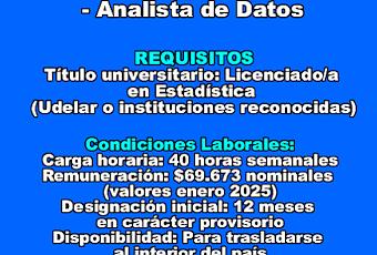Lea con Atención !!Al Final de la Publicación Está el Acceso al Registro...Brindamos la Información Como nos Gusta Recibirla...Inscripciones hasta el 17/11/2025DETALLES DEL ANUNCIO DE EMPLEO👀¿Eres Licenciado/a en Estadística y te apasiona el análisis de datos?El Ministerio de Industria, Energía y Minería (MIEM) convoca a concurso público para proveer 1 puesto de Analista de Datos e Información en la Dirección Nacional de Energía.📍 Información del PuestoCargo: Analista de Datos e InformaciónFormación Requerida: Licenciado/a en EstadísticaEscalafón: A - Personal Profesional UniversitarioGrado: 04 - Asesor XIIUbicación: Rincón 719, MontevideoModalidad: Provisoriato (12 meses, con posibilidad de designación definitiva)