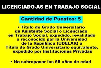 REQUISITOS EXCLUYENTES AL CIERRE DE LA INSCRIPCION• Título de Grado Universitario de Asistente Social o Licenciado en Trabajo Social, expedido, revalidado o reconocido por la Universidad de la República (UDELAR) oTítulo de Grado Universitario equivalente, expedido por Instituciones Privadas,avaladas mediante Decreto de reconocimiento del Ministerio de Educación y Cultura.• No sobrepasar los 55 años de edad