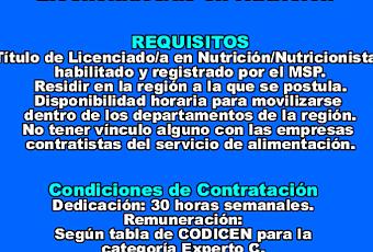 ✅ Requisitos Excluyentes:Título de Licenciado/a en Nutrición/Nutricionista, habilitado y registrado por el MSP.Residir en la región a la que se postula.Disponibilidad horaria para movilizarse dentro de los departamentos de la región.No tener vínculo alguno con las empresas contratistas del servicio de alimentación.