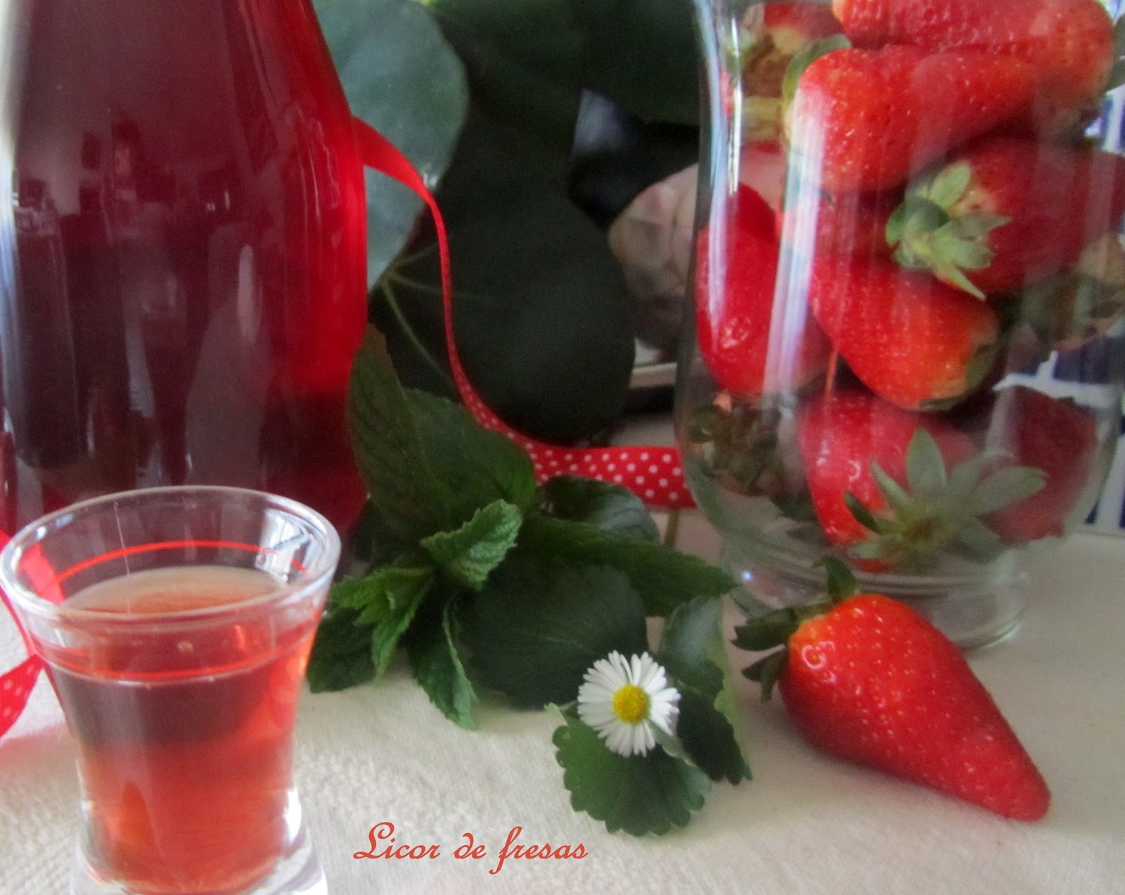 Mis fresales están cuajaditos de fresas, este año no son muy grandes, pero son riquísimas. Sin embargo este licor es de las últimas del año pasada, las puse a macerar en septiembre, como todos, tiene un tiempo de reposo... y yo, lo he tenido otra temporadita más, reposando en el borrador, porque no me convencía ninguna foto de las que le hice (y os aseguro que hice unas cuantas...) ¡que difícil es fotografiar el vidrio! todos son reflejos, si alguien tiene algún truco que me lo cuente.Este licor es un éxito seguro, fue el primero con que el que me atreví... ¡sabe dios! cuantos años ha.... desde entonces hace siempre parte de nuestros licores, cuando se acaba uno hago otro. Se conserva mucho tiempo con excelente sabor, aunque pierde, eso si, ese bonito color y se oscurece un poco más. En una ocasión, lo he hecho cambiando el alcohol por aguardiente, no está mal... pero tiene un sabor mucho más delicado con alcohol alimentario.