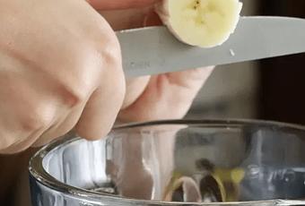 - Añadir el hielo en la jarra de la licuadora, luego las bananas cortadas en trozos, el dulce de leche y por último la leche.