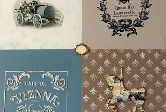 En otro cuandrante utilicé el Azucar moreno de Mary Paint y otra plantilla pero esta vez sin relieve. Forré con servilleta una silueta de madera cuyos bordes envejecí con pátina.
