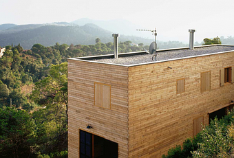 Los paneles de madera laminada pueden quedar vistos en el interior de la vivienda en paredes, techos y suelos. Para reducir costes, en los revestimientos y acabados se ha procurado dejar el máximo número de paramentos vistos. Las instalaciones están ocultas pero sólo se han trasdosado con cartón-yeso los paramentos de las estancias que distribuyen las instalaciones de la casa. Finalmente, la mitad de las estancias han quedado con la estructura vista en todos sus paramentos.Todas las fachadas son ventiladas y acabadas con madera de conífera del tipo pino de Flandes. Los huecos también están resueltos con carpinterías de madera protegidas con postigos practicables. La transpiración de la fachada queda garantizada mediante una lámina tipo TYBEK, transpirable, que protege la madera. La cubierta es plana para reducir el impacto visual de la casa desde la calle. La transpiración de la cubierta se resuelve mediante una lámina de drenaje que crea una pequeña cámara ventilada.