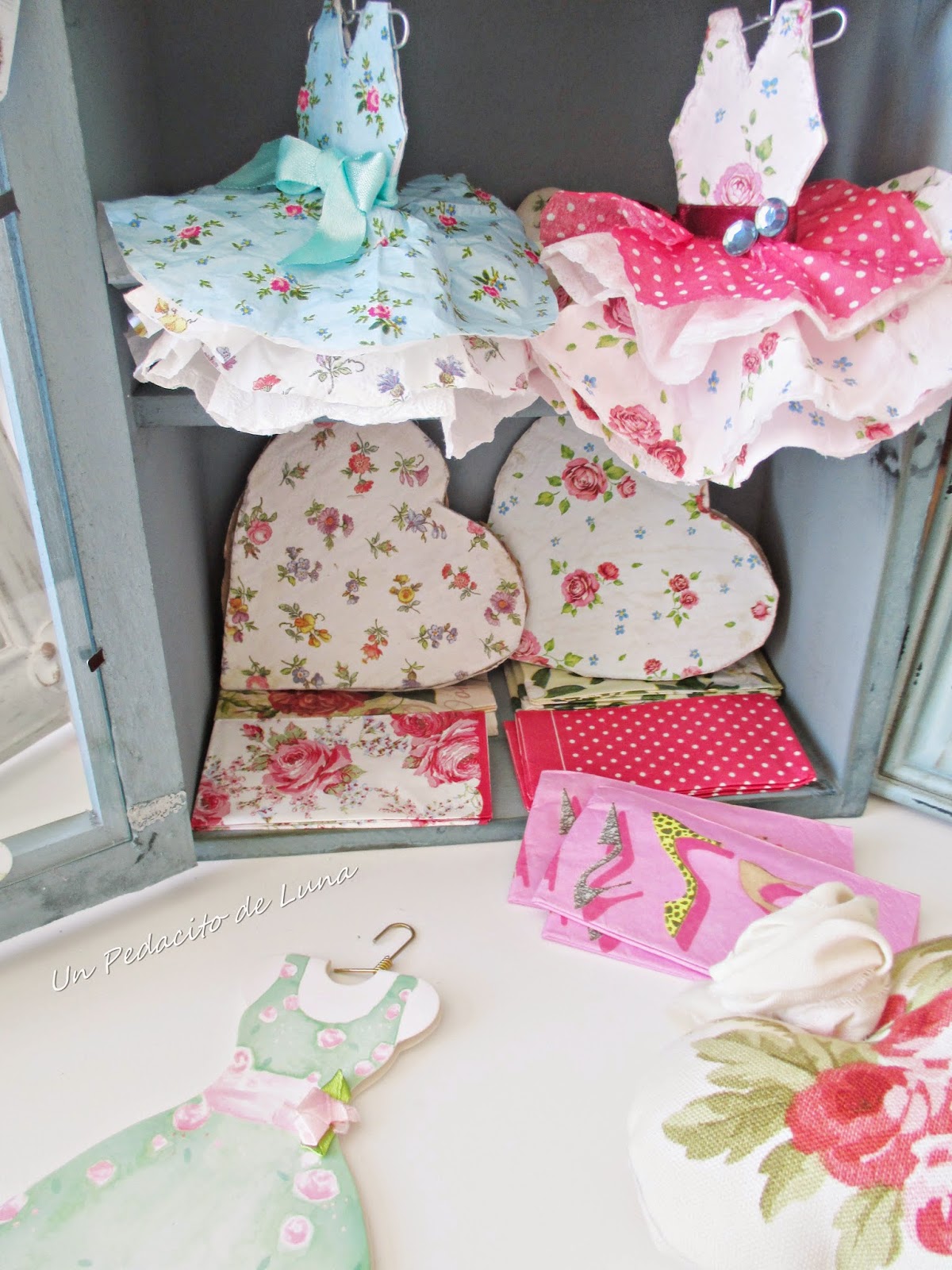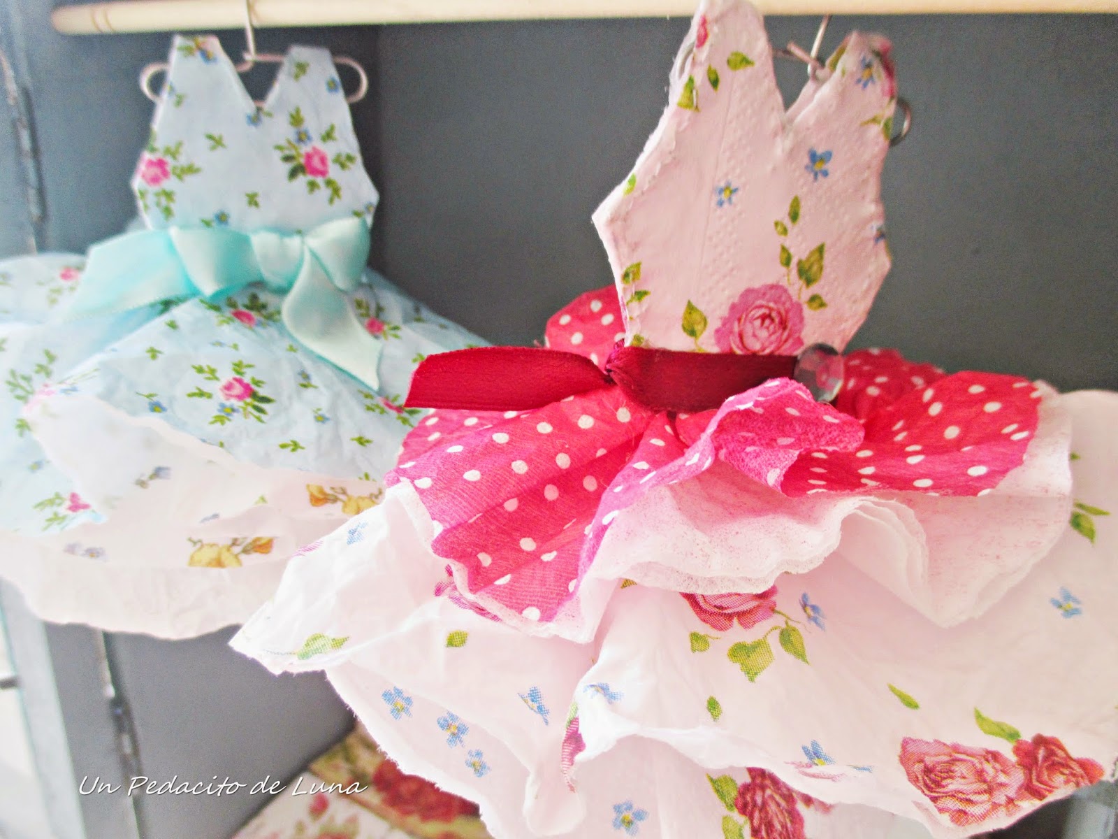 Con cartulina, diferentes servilletas y hasta kleenex, me entretuve una tarde mientras veía una peli confeccionando "a mi manera" estos vestiditos.