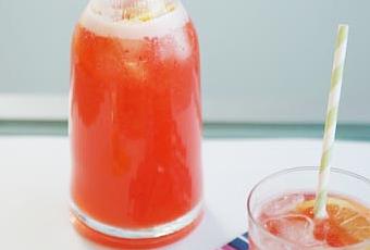 En una jarra grande, unir el puré de fresas, el sirope hecho anteriormente y el zumo de los limones (debéis obtener 240 ml, usando 8 o 10 limones debería bastar). Si usáis vodka, añadirlo y mezclarlo todo bien. Añadir el resto del agua.