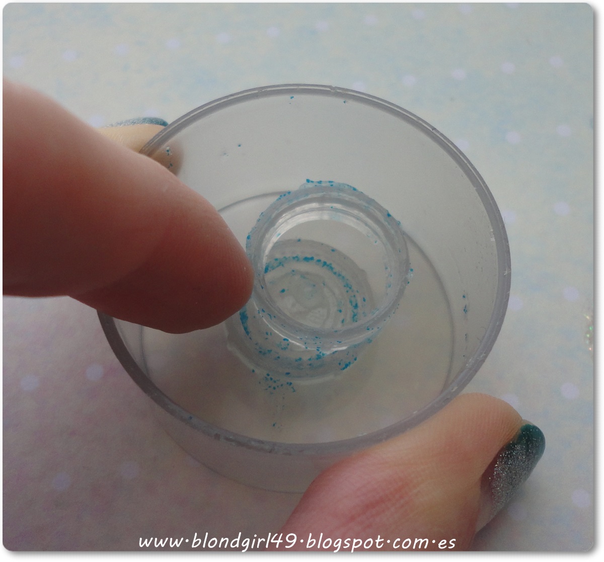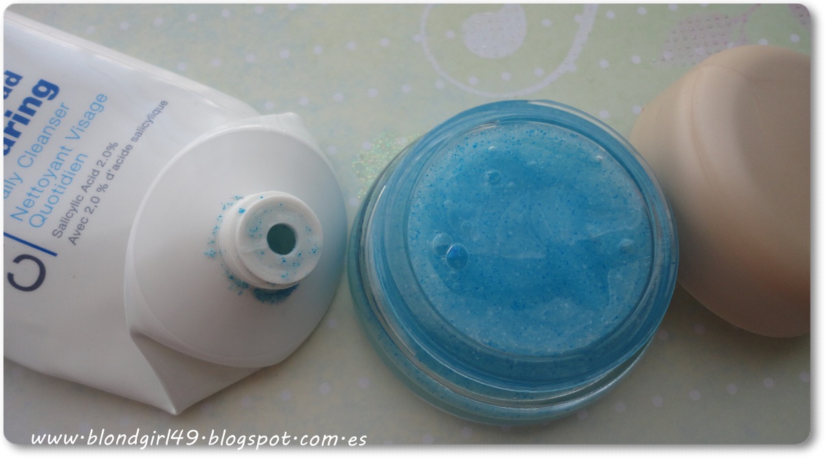 El limpiador es en formatogel transparente congranulitos azules, pero son artificiales así que no rascan la piel como lo harían el azúcar o la sal, por lo que no resulta demasiado agresivo para la piel. Yo siempre he tenido la piel muy sensible así que intento usar productos que no me sean demasiado fuertes, pero también quiero que exfolien así que a veces es difícil encontrar algo que se amolde a mis necesidades. El gel no era espumoso y lo agradecía mucho porque así no me resecaba la piel (puesto que acostumbro a tenerla normal tirando a seca), e incluso al enjuagarla tampoco me hacía demasiada espuma, sólo lo justo y necesario. En cuanto a la densidad, es bastante ligerito y escurridizo, esto era otra de las cosas malas que le veía al producto, me era muy incómodo cerrar el envase si tenía producto en una de las manos porque se me escurría si giraba la mano para cerrarlo jajaja y tampoco podía dejar el tubo tumbado sin cerrar porque sino se hubiera desparramado gel por todo.