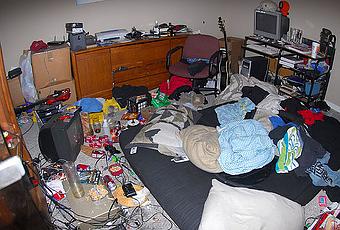 Después de sortear montañas de ropa, supongo que sucia, pilas de comics, cajas vacías de tabaco, cajas vacías de componentes informáticos y doscientos trastos más, logro llegar a la cama que está situada al contrario que dicta la lógica para abrir las ventanas.