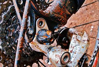 Una cadena sin lubricar es casi tan mala: los pasadores y los rodillos se desgastan mucho más rápido, lo que hace que la cadena se estire en menos tiempo. También hace más ruido, se desplaza con menos suavidad y corre más peligro de romperse debido a las tensiones internas provocadas por el uso y la oxidación.