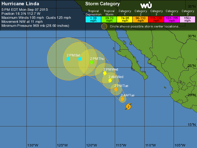 Lo más importante para destacar es que "Linda" tendrá poco cambio en su intensidad durante este día lunes 7 de septiembre, para empezar a perder fuerza durante el día martes 8. Cabe mencionar también que el fenómeno natural tendrá un movimiento general del Noroeste en las siguientes 48 hs, para que apartir del día jueves 10 empiece a girar su movimiento hacia el Oeste y empezar a alejarse de tierras mexicanas mucho más debilitado, según ha informado El Centro Nacional de Huracanes con sede en Miami.Por otra parte El Servicio Meteorológico Nacional de México ha informado en su último boletín que el sistema provocará lluvias muy fuertes en Baja California Sur, Sinaloa, Nayarit, Jalisco y Archipiélago de Revillagigedo, (Colima), lluvias fuertes en Colima y Michoacán, así como lluvias menores en Baja California.