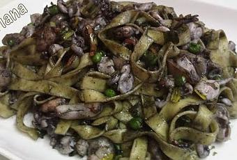 1.- Ponemos el puerro y los pimientos cortados en juliana a pochar con un poco de aceite.2.- Colocamos una cacerola con agua salada y aceite, cuando comience a hervir añadimos la pasta, dejamos los minutos que nos recomiendan, a mi personalmente me gusta que nos quede al-dente, siempre el tiempo recomendado la pasta queda blanda.3.- Añadimos las puntillitas, los guisantes y las gambas a las verduras, cuando este casi a punto añadimos la tinta del calamar.4.- Rectificamos de sal y mezclamos con la pasta recién cocida. Excelente plato...