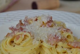 Vuelta a casa. Suelto el bolso, me descalzo, me pongo el delantal y, en veinte minutos, mientras mi "pinche" ralla el queso y abre la última botella de Las Ocho que compramos durante nuestra visita a Bodegas Chozas Carrascal, los Linguini a la Carbonara "auténticos" están listos. Pongo cara de "ves-como-tenía-yo-razón" y suelto: "Ya te decía yo que era mejor comer en casa", no he podido evitarlo, pero es que tienen una pinta.