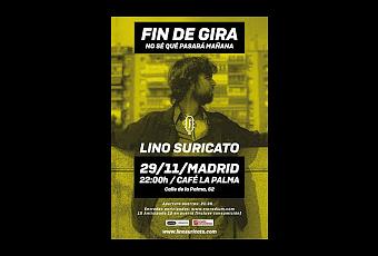 Lino Suricato despide su actual gira en el Café la Palma de Madrid este Jueves por todo lo alto; No sé qué pasará mañana termina. Es el momento de que Lino Suricato cierre etapa y lo hará por todo lo alto en Café la Palma de Madrid.