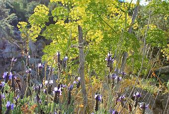 Matorral grosero: en primer plano, Lavandula multifida. Detrás, inflorescencias de Ferula communis.