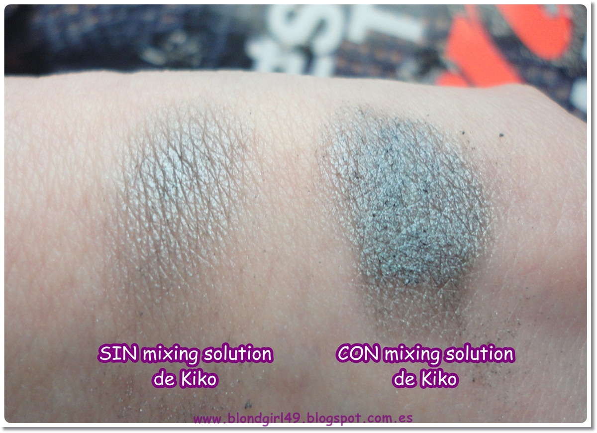 MIXING SOLUTION DE KIKO:Bueno de este producto creo que no hace falta que hable demasiado jajaja todas lo conocéis de sobras, yo lo he visto en muchísimos blogs y al final lo acabé comprando porque realmente funciona y así uso un poco más las sombras que no pigmentan tanto jeje.Lleva 50ml y su precio es de 3,90€Abajo podéis ver la diferencia usando o no el mixing: