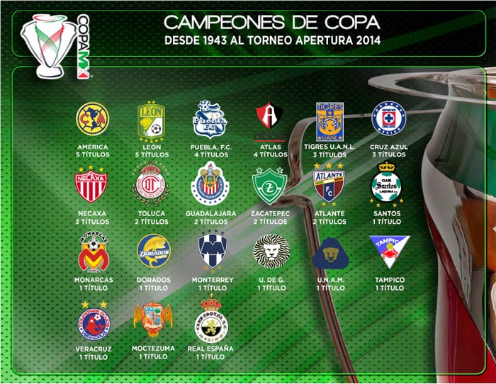 Esta es la lista de los campeones de CopaMx del futbol mexicano en donde América y León son líderes con 5 copas, seguidos de Puebla y Atlas con 4, Tigres, Cruz Azul y Necaxa con 3.