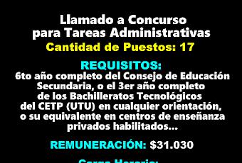 Requisitos Excluyentes:Los postulantes deben cumplir con los siguientes requisitos:Formación: 6to año completo del Consejo de Educación Secundaria, o el 3er año completo de los Bachilleratos Tecnológicos del CETP (UTU) en cualquier orientación, o su equivalente en centros de enseñanza privados habilitados.Otros: Conocimiento de herramientas de paquete Office (Word, Excel, Powerpoint) e Internet.